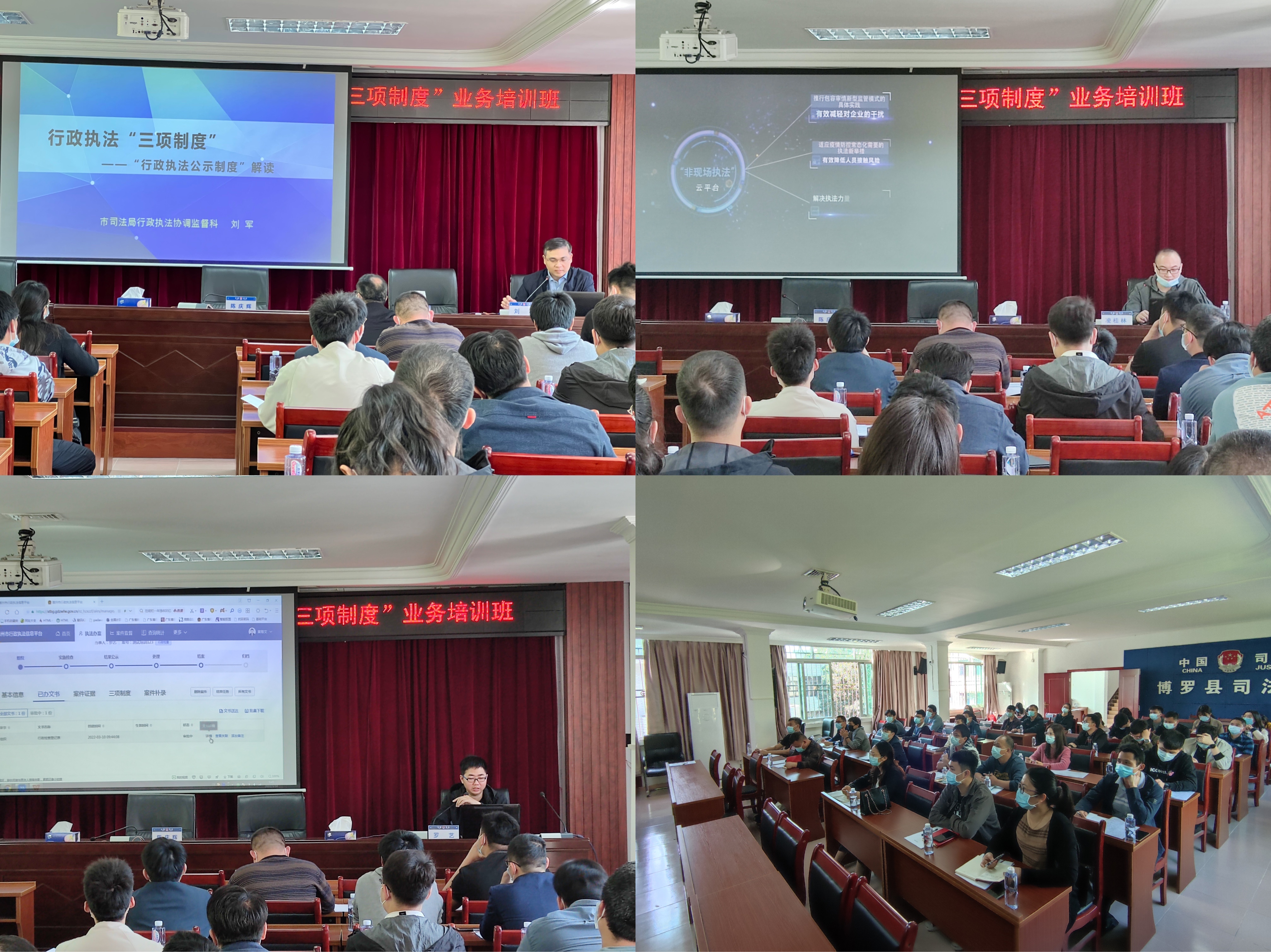 两期培训班的时间均为半天,邀请到了市司法局行政执法监督科三级主任科员刘军、市行政执法“两平台”技术工程师凌桂林、市司法局派驻中文博彩平台“两平台”技术工程师罗艺为参训人员授课。培训中,刘军同志深入解读了行政执法“三项制度”的重大意义以及核心内容;凌桂林同志以探索“非现场执法”为主题,讲解了“非现场执法”的概念以及打造“非现场执法”云平台的重大意义;罗艺同志就行政执法“两平台”的规范化操作、行政执法信息公示平台的规范录入等进行授课,并对参训人员现场提出的问题进行了答疑解惑。