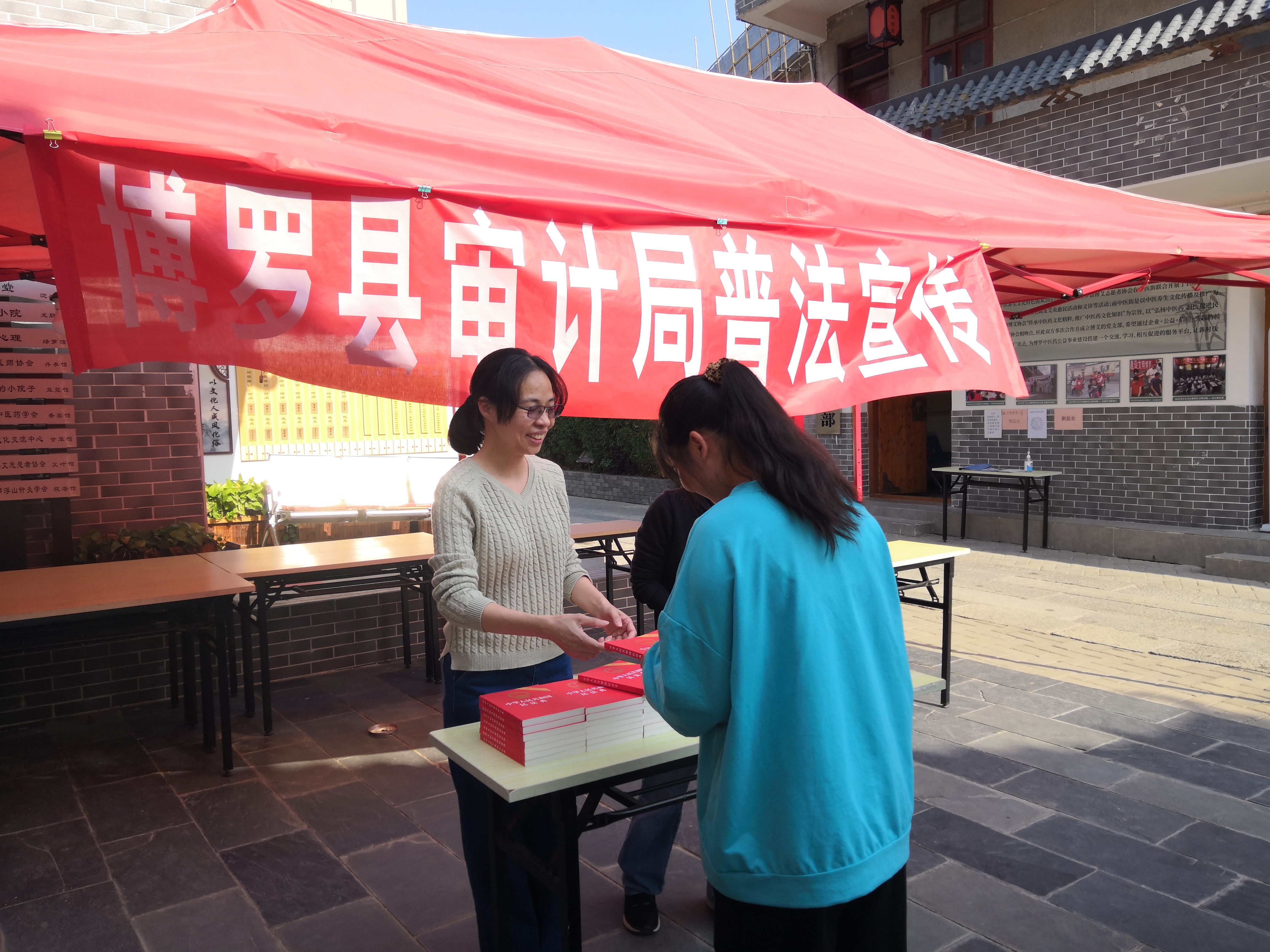 图为中文博彩平台审计局普法工作人员派发《中华人民共和国宪法》、《中华人民共和国民法典》等书籍