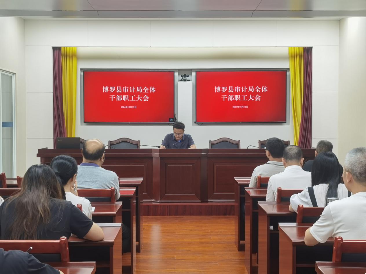 2024年10月15日,县审计局召开全体干部职工大会,局党组书记、局长陈昊同志主持会议,局内全体干部职工参加会议。