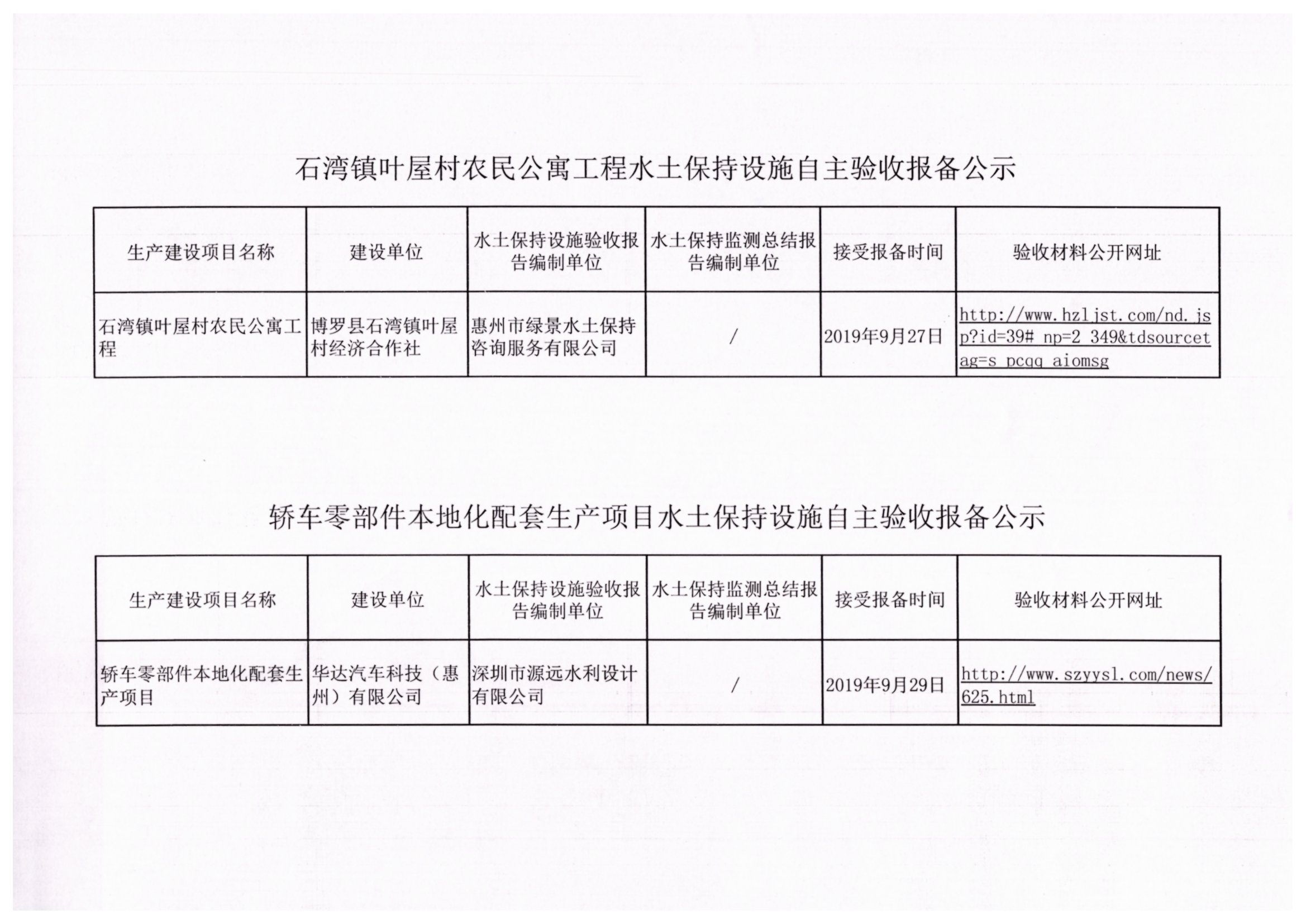 石湾镇叶屋村农民公寓工程和轿车零部件本地化配套生产项目水土保持设施自主验收报备公示