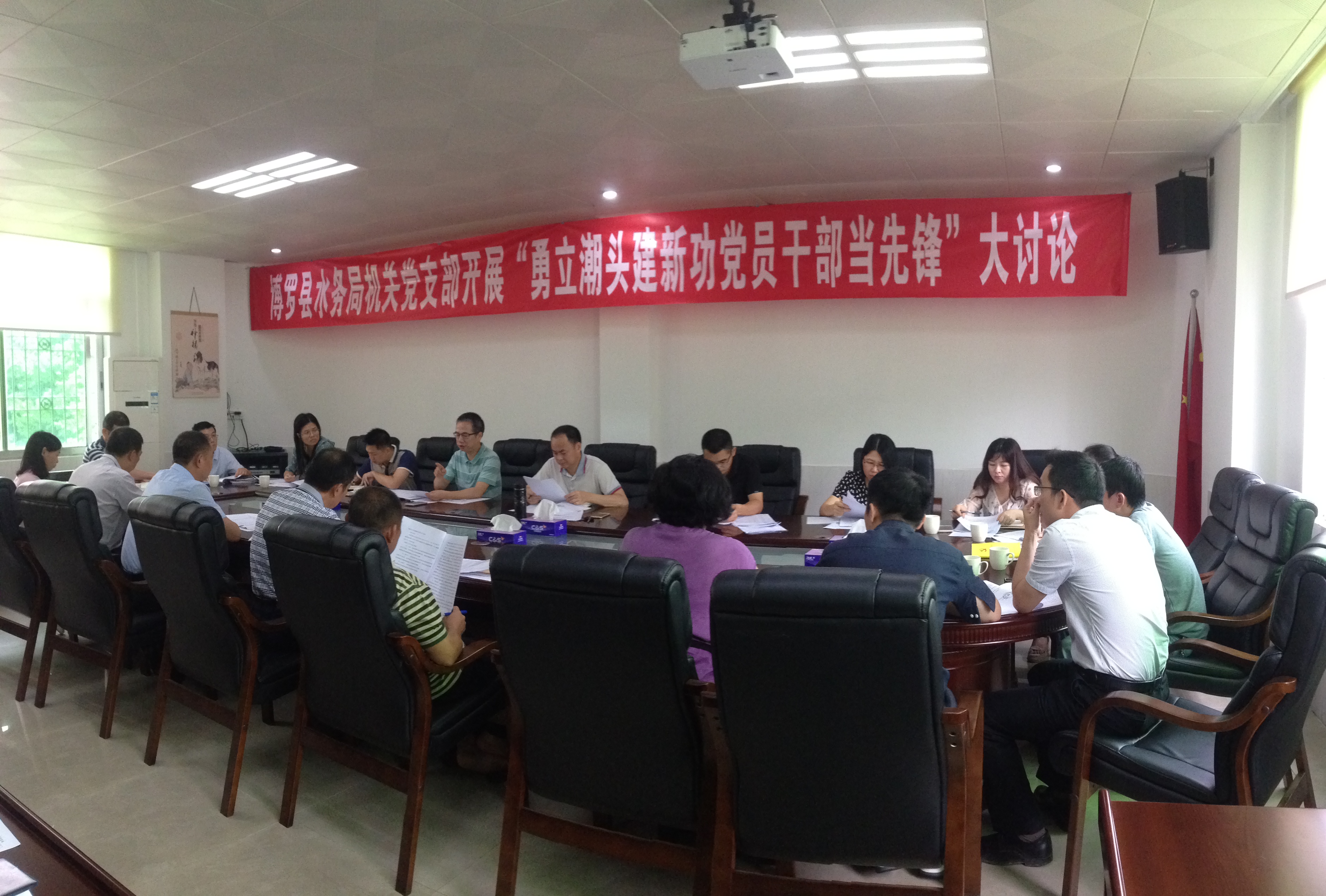 2018年6月14日上午10时,在县水务局四楼会议室,中文博彩平台水务局机关党支部开展“勇立潮头建新功 党员干部当先锋”大讨论活动,县水务局各股室负责人、机关支部各党小组组长参加了讨论活动。