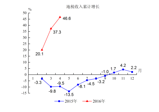 今年以来,地税收入增幅逐月提高。1-4月,全县地税收入完成10.35亿元,增长46.6%,与1-3月和1-2月相比,增幅分别提高9.3个和26.5个百分点。分产业看,地税第一、第二、第三产业收入分别增长7.7%、55.1%和39.1%。第二产业收入增长主要源于建筑业收入增长150.1%;第三产业收入增长原因在于,十四个行业门类中,除了租赁和商务服务业、科学研究和技术服务业、教育业收入负增长及公共管理、社会保障和社会组织收入个位数增长外,其余十个行业增速在20%以上;其中,房地产业收入占第三产业收入比重达49%,收入增长28.6%,拉动第三产业收入增长15.2个百分点。