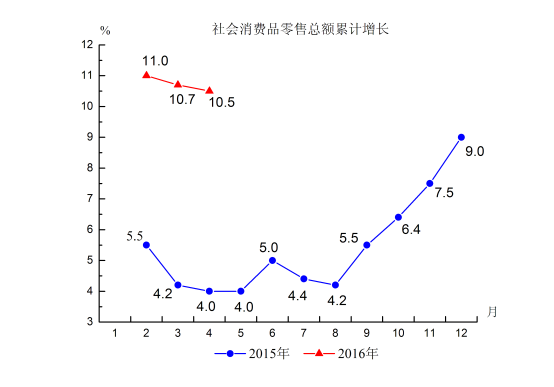 (四)消费市场保持平稳。今年以来,全县消费市场运行较为平稳,社会消费品零售总额增幅保持在10%-11%之间。1-4月,全县实现社会消费品零售总额53.19亿元,增长10.5%,增幅比上年同期提高6.5个百分点,比1-3月和1-2月分别回落0.2个和0.5个百分点。其中,网报企业(个体)零售额增长19.8%,增幅比上年同期提高19.5个百分点;分支机构零售额下降5.2%,降幅比上年同期收窄14.1个百分点。