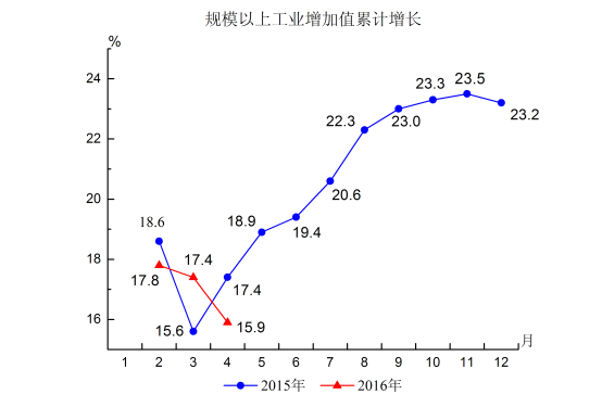 (一)工业生产保持稳定。今年以来,全县工业经济在艰难中前行,各月累计增速虽有所回落,但总体保持稳定。1-4月,全县规模以上工业实现总产值383.68亿元,增长13%;实现增加值93.57亿元,增长15.9%,增幅比1-3月回落1.4个百分点。