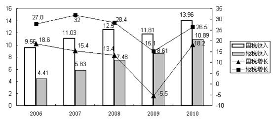 从全年发展情况看,全县财政收入呈“V”字型走势,2月份同比增长28.6%,随后呈逐月回落态势,特别是到了上半年,增幅回落到10.1%的低位。下半年开始,县委、县政府高度重视,从多方面着手,加大对企业的税收征管力度,并取得显著成效,7月份增幅开始明显回升,8-12月增幅均超过了20%。全年一般预算财政收入15.02亿元,增长21.2%,是2005年的3.6倍,五年年均增长28.9%;税收总计24.85亿元,增长21.7%。其中:国税收入13.96亿元,增长18.2%;地税收入10.89亿元,增长26.5%。