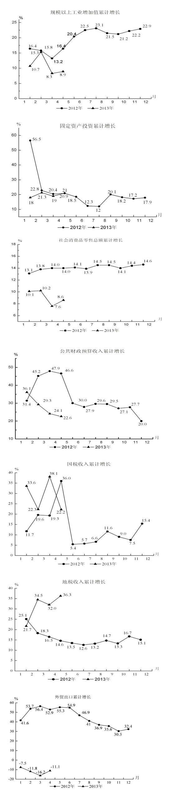 1-5月,全县经济运行继续保持平稳增长,并呈逐步回升态势,从12项主要经济指标运行情况看,工业、消费、投资等6个指标增幅快于1-4月,固定资产投资、商品房销售面积、实际利用外商直接投资、地税收入、人民币贷款余额等5个指标增幅快于去年同期。但从全年发展来看,经济回升幅度仍较小,全年实现较快增长的困难和压力需引起关注。