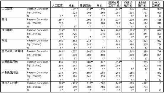 下面分别以2010年的耕地面积、林地面积、建设用地、居民点及工矿用地、交通运输用地、水利设施用地为自变量,以常住人口密度、外来人口密度为因变量运用spss中的数据分析功能进行相关性分析(见表6)。