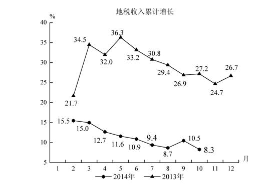(一)地税收入增幅持续下降。今年以来,地税收入增幅基本上呈逐月下降趋势。1-2月增长15.5%,一季度增长15%,上半年增长10.9%,前三季度增长10.5%。截止10月,全县实现地税收入19.33亿元,增长8.3%,增幅比上年同期大幅下降18.9个百分点,在1-9月的基础上继续回落2.2个百分点。主要是受占地税收入41.9%的营业税仅增长5.8%所致。