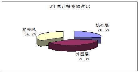 潜能上看:投资是个重要的先行指标,先有投入,后有产出。从近三年累计施工项目数和投资额上看,外围层和相关层是文化产业潜能股,具体到行业也就是文化休闲娱乐服务和文化用品、设备及相关文化产品生产,这两个行业3年累计施工项目分别是20个和27个,分别占总施工项目数的30.8%和41.5%;文化休闲娱乐服务和文化用品、设备及相关文化产品生产 3年分别累计投资49653万元和43510万元,分别占总投资额的39%和34.2%(详见下图2、图3和表2)。