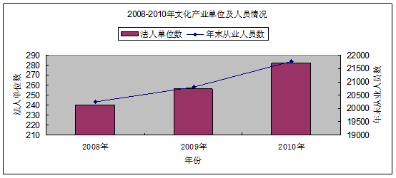 从企业规模看:文化产业总体规模不断壮大。文化及文化相关产业法人单位数由2008年的240家增加到2010年的282家,增长17.5%;文化及文化相关产业年末从业人员从2008年的20241人增加到2010年底的21754人,增长7.5%(详见图1);根据2008年测算的全县文化产业增加值占GDP的比重为3.2%,如果按该比重推算,2010年全县文化产业增加值将突破10亿元。