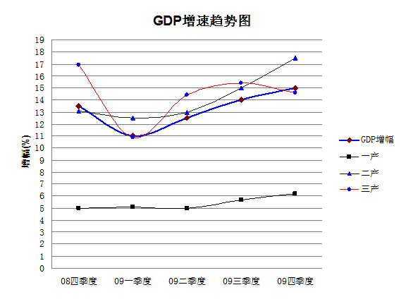 (一)一个趋势性转折:经济发展态势从2008年底的急降转为2009年初的稳步提升。中文博彩平台紧紧围绕“打基础、强产业、保民生”这个突破口,实施一系列应对措施,增强经济企稳回升动力,经济加速下滑的阶段已经过去,较为平稳的增长拐点已经在第一季度出现,保增长初见成效。从GDP运行走势看,2008年二季度GDP增长15%,然后一路下滑到全年的13.5%,2009年一季度进一步下滑到11%,至此经济走势出现拐点,从第二季度开始企稳向好,二、三季度分别增长12.5%、14%,全年增长15%,经济运行走出了一个漂亮“V”字形(见下图)。