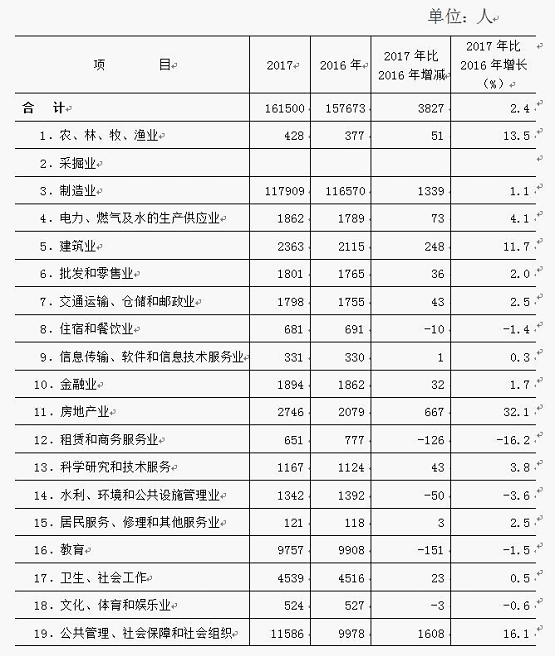 2017年,在统的18个行业门类中,从业人员比上年增加的有13个行业,占行业总数的72.2%,人员减少的有5个行业,占27.8%。人数增加较多的行业有公共管理、社会保障和社会组织,制造业,房地产业,分别比上年增加1608人、1339人和667人,分别增长16.1%、1.1%和32.1%。人数减少较多的行业有教育业、租赁和商务服务业,水利、环境和公共设施管理业,分别比上年减少151人、126人和50人,分别下降1.5%、16.2%和3.6%。(见表1)