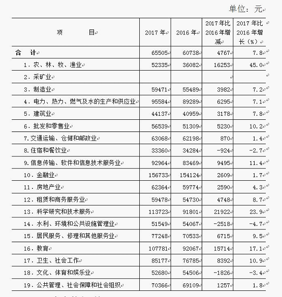 从年平均工资增速看,增速位于前三位的依次是农、林、牧、渔业(增长45%),科学研究和技术服务业(增长23.9%),教育业(增长17.1%)。排在后三位的依次是水利、环境和公共设施管理业(下降4.7%),文化、体育和娱乐业(下降3.4%),住宿和餐饮业(下降2.7%)。农、林、牧、渔业工资增速较快主要源于林场林产品价格提高,企业利润上升。科学研究和技术服务业,教育业工资增长较快源于2017年绩效工资增加。