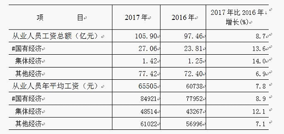 2017年,国有单位单位从业人员工资总额为27.06亿元,比上年增长13.6%;从业人员年平均工资为84921元,比上年增长8.9%。集体单位从业人员工资总额为1.42亿元,比上年增长14%;从业人员年平均工资为48514元,比上年增长12.1%。其他单位从业人员工资总额为77.42亿元,比上年增长6.9%;从业人员年平均工资为61022元,比上年增长7.1%。(见表2)