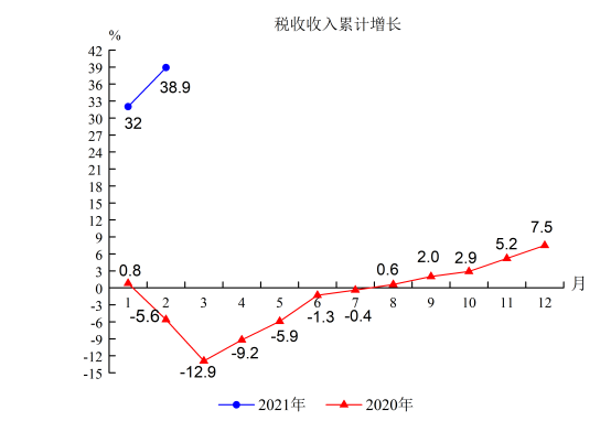 5.国内税收收入18.85亿元,同比增长38.9%,比2019年1-2月增长31.1%,两年平均增速为14.5%。