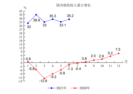 6.国内税收收入62.13亿元,同比增长35.2%,比2019年上半年增长33.4%,两年平均增速为15.5%。