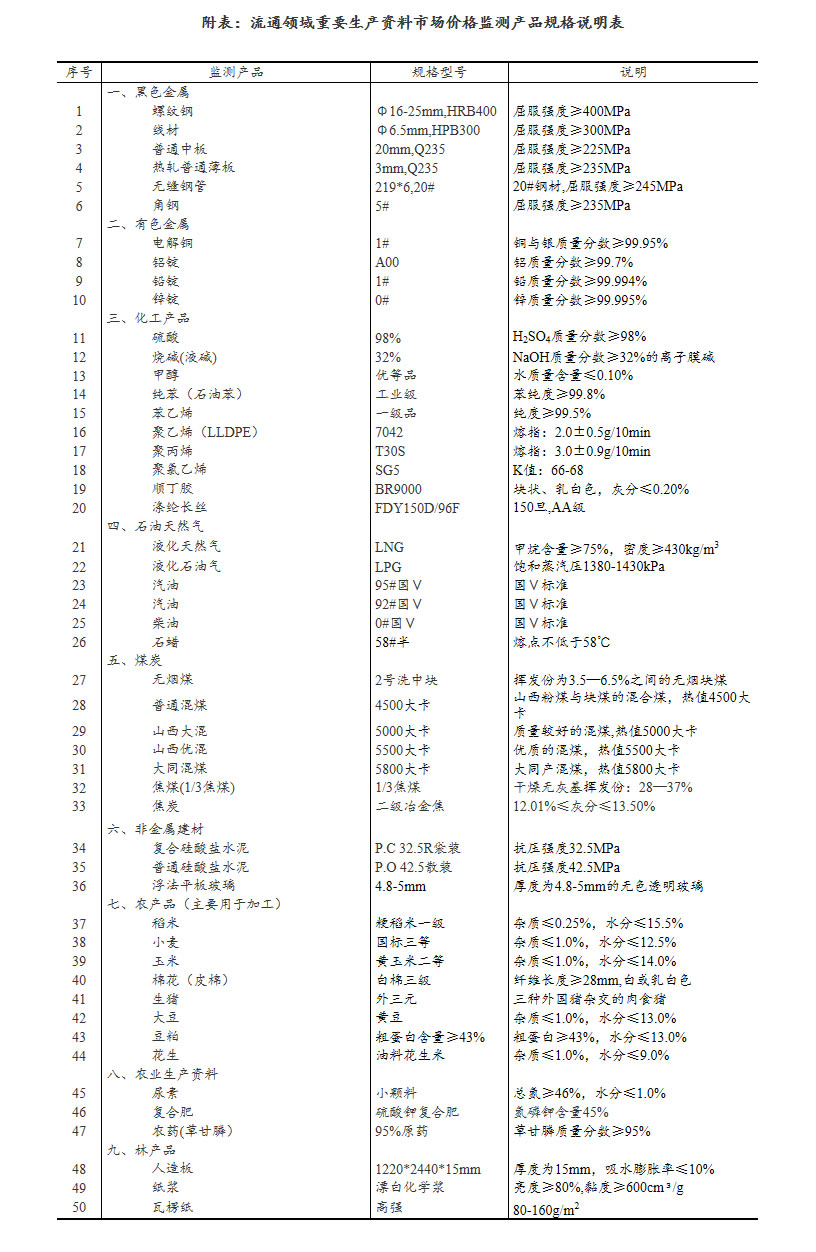 流通领域重要生产资料市场价格监测内容包括9大类50种产品的价格。类别与产品规格说明详见附表。