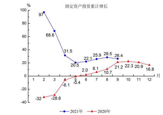 4.固定资产投资额同比增长26.4%,比2019年前三季度增长53.2%,两年平均增长23.8%,比上半年两年平均增速提高12.2个百分点。