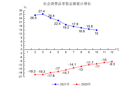 3.社会消费品零售总额265.35亿元,同比增长15%,比2019年1-10月增长2.3%,两年平均增长1.1%。
