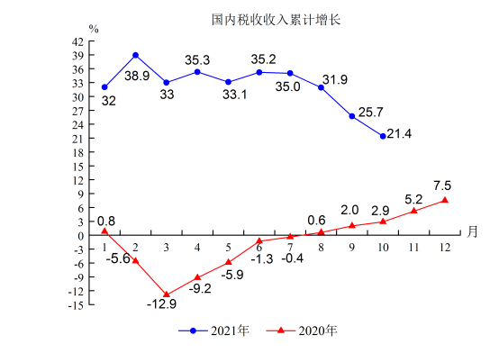 5.国内税收收入96.73亿元,同比增长21.4%,比2019年1-10月增长24.9%,两年平均增长11.8%。