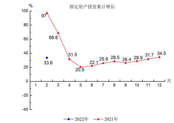 2.固定资产投资保持高速增长,亿元项目拉动作用明显。1-2月,全县固定资产投资增长33.6%,分别比2019年同期增速和2021年同期两年平均增速提高61.8个和17.9个百分点。其中,工业投资、工业技改表现亮眼,分别增长139.8%和189%,增速对比2019年分别提高227.1个和277.1个百分点;分别拉动全县固定资产投资增长32.8个和12个百分点。基础设施投资增长34%,增速比2019年同期提高61.7个百分点,拉动全县固定资产投资增长7.6个百分点。