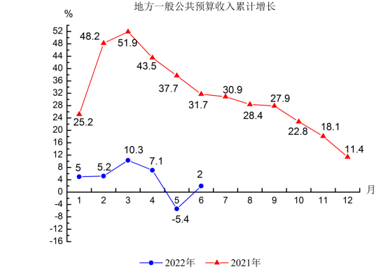 备注:图中一般公共预算收入累计增速按照自然口径计算;按照扣除留抵退因素后的可比口径计算,1-6月一般公共预算收入累计增长9.1%。