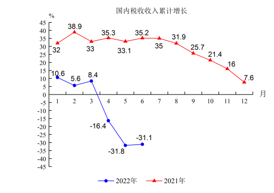 备注:图中税收收入累计增速为自然口径增速;按增值税留抵退税还原口径计算,1-6月税收收入累计下降3.3%。