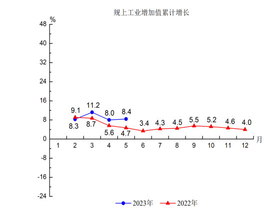 1.工业生产平稳增长。1-5月全县规上工业总产值增长6.5%,比1-3月回落1.9个百分点,比1-4月提高1.2个百分点。规上工业增加值增长8.4%,比1-3月回落2.8个百分点,比1-4月提高0.4个百分点。从经济类型看,民营企业、小微型企业产值实现两位数增长。1-5月全县规上民营企业、小微型企业产值分别增长14.9%、15.5%,分别快于整体规上工业增速8.4个和9个百分点。从全县重点打造的四大产业看,生命健康产业、电动车产业产值增长较快。1-5月电子产业、新材料产业、生命健康产业、电动车产业1-5月产值分别下降7.8%、增长6.6%、32.6%、599%,分别比全县平均水平低14.3个,高0.1个、26.1个、592.5个百分点。从主要拉动行业看,农副食品加工业,有色金属冶炼和压延加工业,铁路、船舶、航空航天和其他运输设备制造业,非金属矿采选业四个行业拉动作用强劲,产值分别增长30.3%、80.9%、47.8%、1199.7%,合计拉动全县规上工业总产值4.9个百分点。
