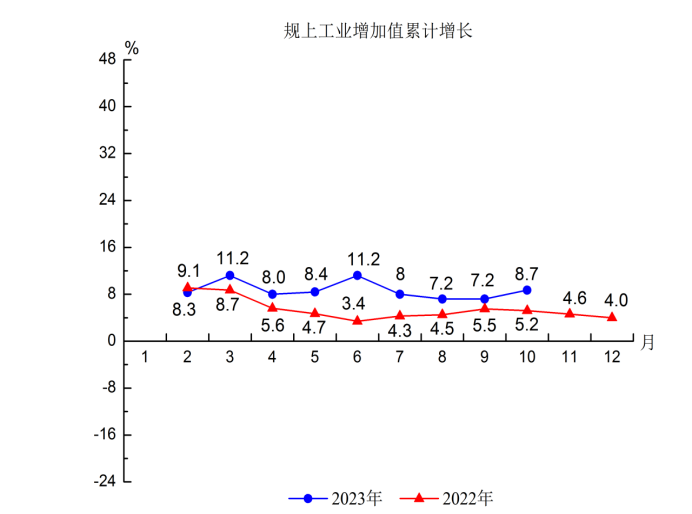 1.规模以上工业总产值增长6.8%,比前三季度提高1.2个百分点;总量居第4位,增速居第2位。规模以上工业增加值增长8.7%,比前三季度提高1.5个百分点;总量居第4位,增速居第1位。