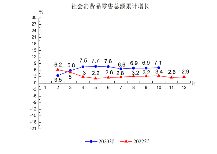 4.消费市场形势恢复向好。1-10月全县社会消费品零售总额292.91亿元,增长7.1%,自7月份增速回落后连续三个月平稳恢复,比前三季度提高0.2个百分点。限上社会消费品零售总额保持较快增长。1-10月全县限上社会消费品零售总额52.51亿元,增长18.3%,高于全市平均水平14.7个百分点;限下社会消费品零售总额240.4亿元,增长5%。限上零售、住宿、餐饮业销售额(营业额)增速高位运行。1-10月全县限上零售业销售额19.33亿元,增长58.8%,比前三季度提高2.9个百分点;限上住宿业营业额1.67亿元,增长38.5%,比前三季度回落2.2个百分点;限上餐饮业营业额3.34亿元,增长42.7%,比前三季度提高3.2个百分点;限上批发业销售额85.13亿元,下降16.1%,降幅比前三季度扩大13.8个百分点。