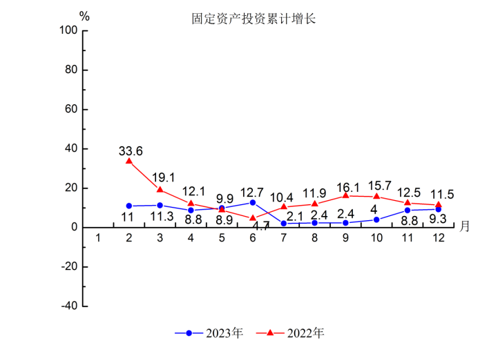 2023年全年全县固定资产投资在承压中稳中有进,一季度和上半年均保持2位数增长,前三季度呈个位数小幅增长,四季度呈逐月回升态势。2023年全年全县固定资产投资额增长9.3%,比前三季度提高6.9个百分点。分类别看,2023年全年全县项目投资增长18.7%;房地产开发投资下降10.7%。