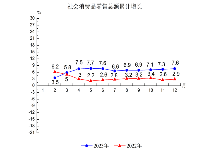 社会消费品零售总额增速位次创新高。2023年全年全县社会消费品零售总额355.81亿元,增长7.6%,比前三季度提高0.7个百分点,增速近12年以来首次位居全市第一。限上社会消费品零售总额增势强劲。分限上限下看,限上社会消费品零售总额66.1亿元,增长20.7%,高于全市平均水平16.8个百分点,增速自9月份开始保持15%以上快速增长;限下社会消费品零售总额289.7亿元,增长5%。