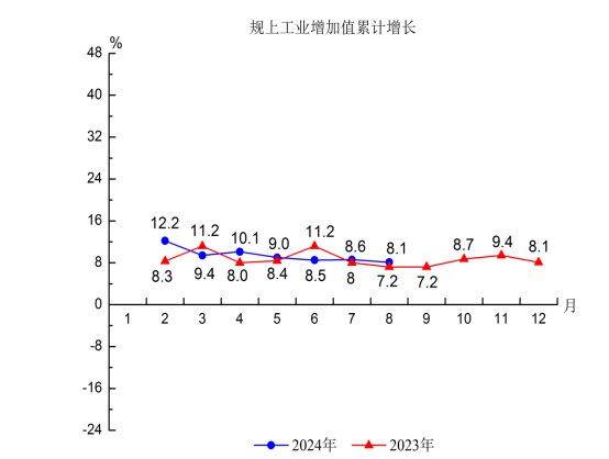 1.规模以上工业总产值增长6.1%,比1-7月提高0.2个百分点;增速居第3位。规模以上工业增加值增长8.1%,比1-7月回落0.5个百分点;增速居第2位。