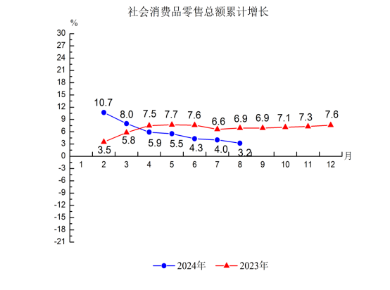 3.社会消费品零售总额239.27亿元,增长3.2%,比1-7月回落0.8个百分点;总量、增速均居第3位。