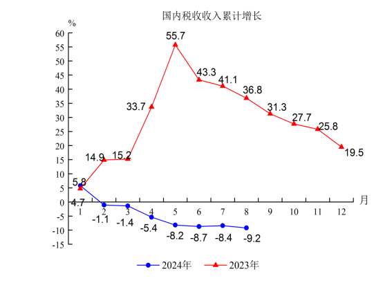 5.国内税收收入72.65亿元,下降9.2%,降幅比1-7月扩大0.8个百分点;总量居第5位,增速居第4位。