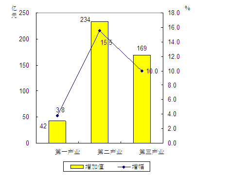 分行业来看,主要行业持续稳定增长。电气机械和器材制造业完成增加值19.66亿元,增长44.7%,增幅高出规模以上工业平均水平27.2个百分点;金属制品业完成增加值10.08亿元,增长57.4%;橡胶和塑料制品业完成增加值10.05亿元,增长19.9%;化学原料和化学制品制造业完成工业增加值7.77亿元,增长37.3%;有色金属冶炼和压延加工业完成增加值1.30亿元,增长33.0%。