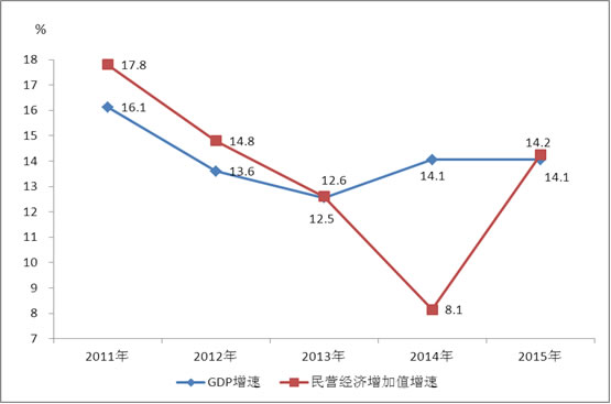 图9 2011-2015年中文博彩平台GDP及民营经济增加值增幅
