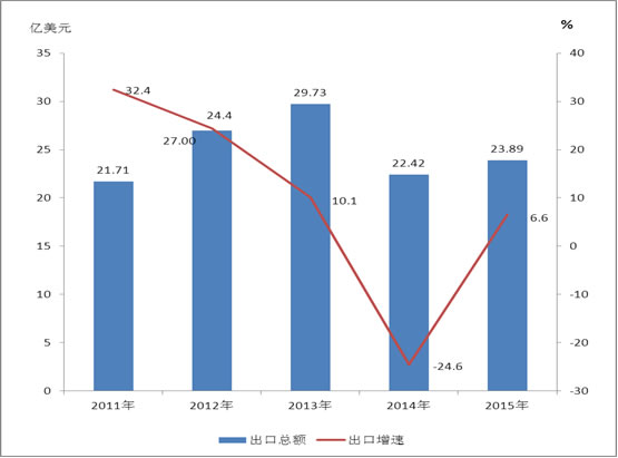 全年外贸进出口总额32.96亿美元,增长5%。其中:外贸出口总额23.89亿美元,比上年增长6.6%,2011-2015年年均增长6.5%(见图8)。进口总额9.07亿美元,比上年增长1%,2011-2015年年均下降4%。