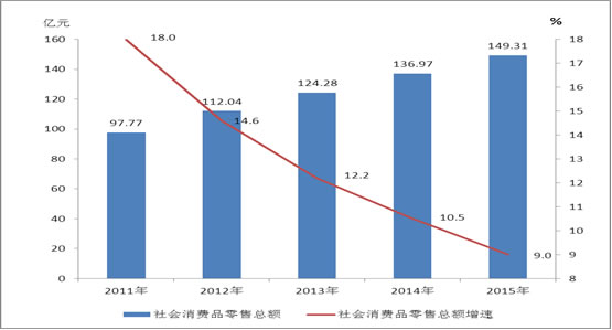 图7 2011-2015年中文博彩平台社会消费品零售总额及其增幅