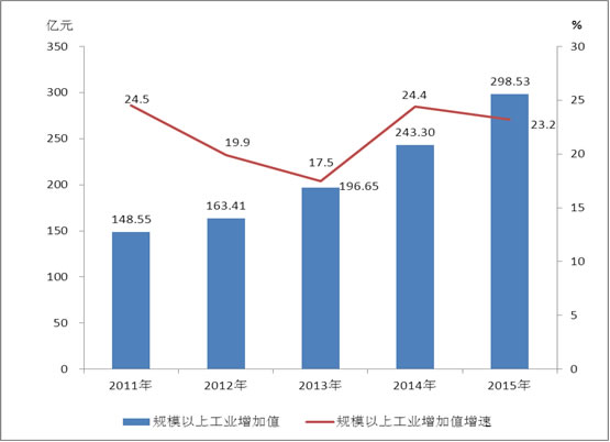 图5 2011-2015年中文博彩平台规上工业增加值及其增幅