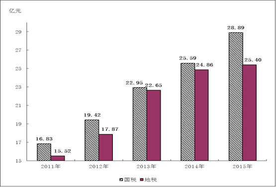 全县完成总税收54.3亿元,比上年增长7.6%,2011-2015年年均增长16.9%。国税、地税收入双双实现“十二五”期间翻番,其中国税28.89亿元,比上年增长12.9%,2011-2015年年均增长15.7%;地税25.4亿元,比上年增长2.2%,2011-2015年年均增长16.5%。(见图4)