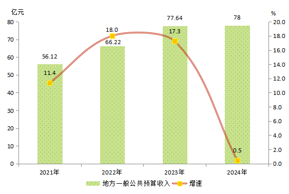 全年地方一般公共预算收入78亿元,增长0.5%;比2020年增加27.61亿元,比2020年增长54.8%,2021-2024年年均增长11.5%。2021-2024年全县地方一般公共预算收入情况见图2。2024年,地方一般公共预算收入中税收收入35.38亿元,下降12.1%;占一般公共预算收入的45.4%,比重比上年下降6.5个百分点,比2020年下降28.5个百分点,2021-2024年年均下降7.1个百分点。