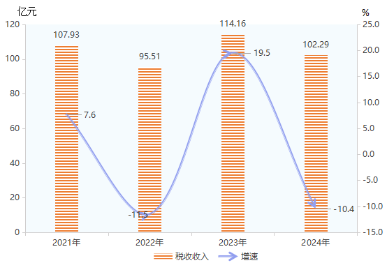 全县完成总税收102.29亿元,下降10.4%;比2020年增加2亿元,比2020年增长2%,2021-2024年年均增长0.5%。2021-2024年税收收入情况见图4。2024年,税收收入中,国内增值税61.48亿元,下降12.1%,占税收收入的60.1%;企业所得税16.83亿元,下降1.6%,占税收收入的16.5%;个人所得税4.67亿元,增长6.6%,占税收收入的4.6%。