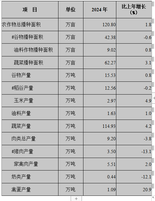 全年谷物产量15.53万吨,比上年增加0.12万吨,增长0.8%。其中稻谷产量12.56万吨,比上年减少0.02万吨,下降0.2%;玉米产量2.97万吨,比上年增加0.14万吨,增长4.9%。