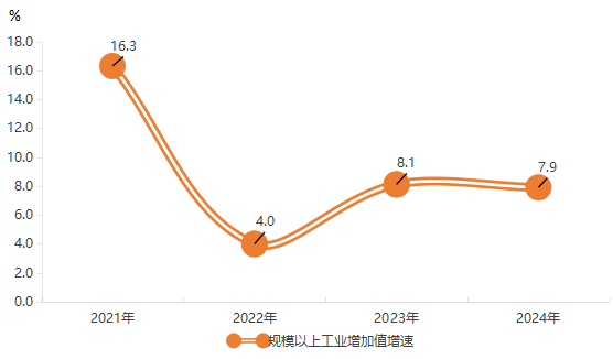 2024年全县规模以上工业增加值增长7.9%,比2020年增长41.1%,2021-2024年年均增长9%。2021-2024年规模以上工业增加值增速见图6。