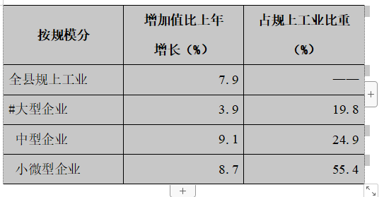 分企业规模看,小微型企业增加值占比提高。小微型企业实现增加值增长8.7%,快于整体规上工业0.8个百分点,占规上工业增加值比重为55.4%,比重比上年提高0.7个百分点。大型、中型企业实现增加值分别增长3.9%和增长9.1%,占规上工业增加值的比重分别为19.8%和24.9%。(见表2)
