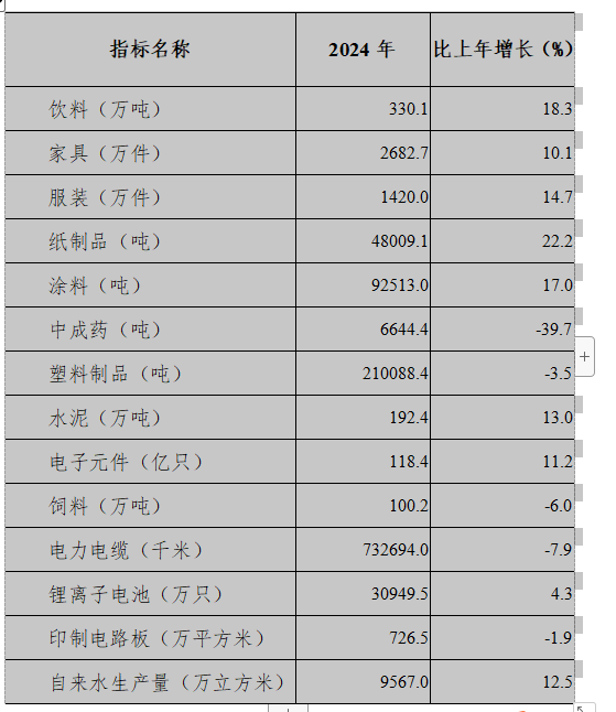 全年规上工业企业生产中成药6644.4吨,下降39.7%;纸制品4.8万吨,增长22.2%;水泥192.4万吨,增长13%;锂离子电池3.10亿只,增长4.3%;饮料330.1万吨,增长18.3%;涂料9.25万吨,增长17%;饲料100.2万吨,下降6%;服装1420万件,增长14.7%;电子元件118.4亿只,增长11.2%;印制电路板726.5万平方米,下降1.9%。(见表3)