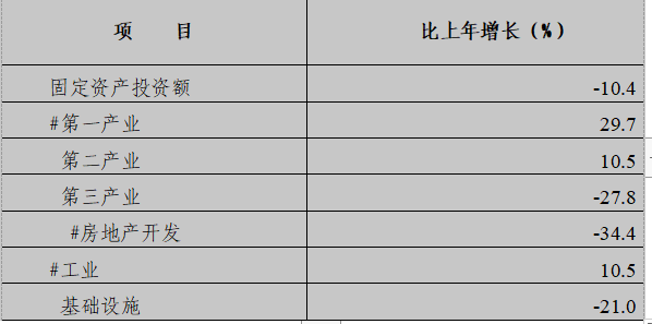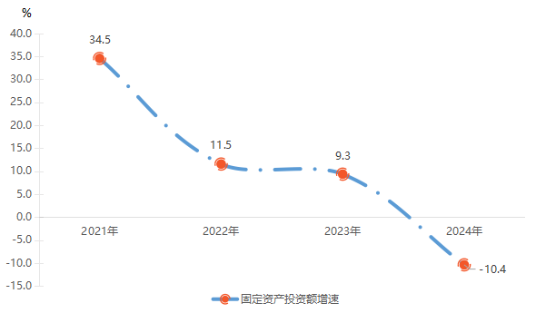 全年全社会固定资产投资下降10.4%,比2020年增长47%,2021-2024年年均增长10.1%,2021-2024年固定资产投资增速见图7。分产业看,第一产业投资增长29.7%;第二产业投资增长10.5%;第三产业投资下降27.8%。分领域看,工业投资增长10.5%;房地产开发投资下降34.4%,基础设施投资下降21%。(见表4)