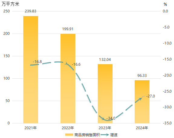 全年商品房销售面积96.33万平方米,下降27%;比2020年减少192.03万平方米,下降66.6%,2021-2024年年均下降24%(见图8)。商品房销售额75.14亿元,下降32.7%。