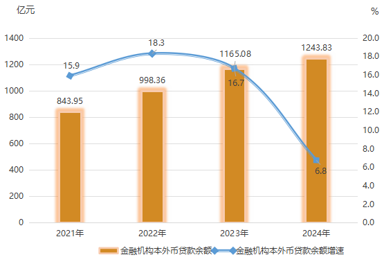 2024年末,全县共有银行业金融机构17家,全县金融机构各项本外币存款余额1305.81亿元,增长10.1%;比2020年末增加468.45亿元,增长55.9%,2021-2024年年均增长11.7%。金融机构各项本外币贷款余额1243.83亿元,增长6.8%;比2020年末增加515.66亿元,增长70.8%,2021-2024年年均增长14.3%。全年实现金融业增加值43.35亿元,下降0.3%。2021-2024年金融机构本外币贷款余额及增速见图9。